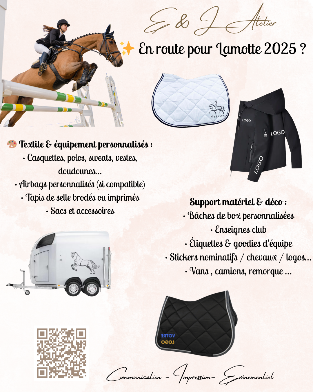 E & J Atelier, propose des créations personnalisées pour les clubs, cavaliers et équipes en route pour les championnats :